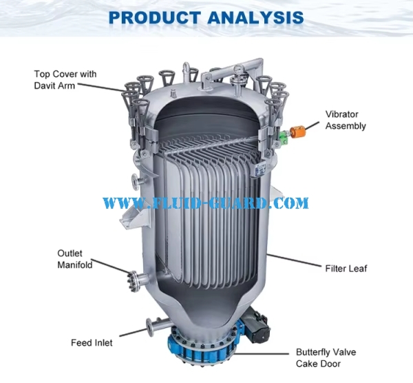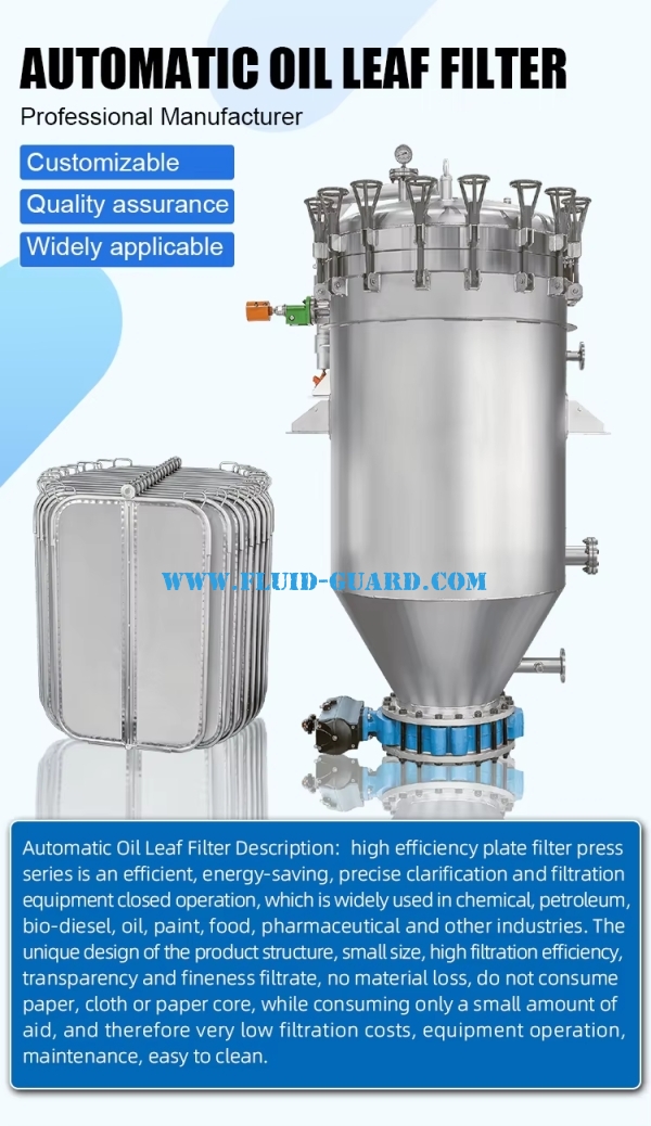 Automatic Oil Leaf Filter Description: high efficiency plate filter press series is an efficient, energy-saving, precise clarification and filtration equipment closed operation, which is widely used in chemical,petroleum, bio-diesel, oil, paint, food, pharmaceutical and other industries.The unique design of the product structure, small size, high filtration efficiency, transparency and fineness filtrate, no material loss, do not consume paper, cloth or paper core, while consuming only a small amount of aid, and therefore very low filtration costs, equipment operation,maintenance, easy to clean.